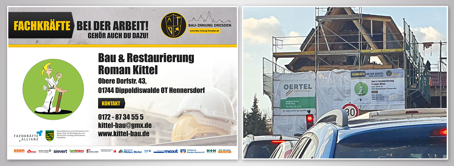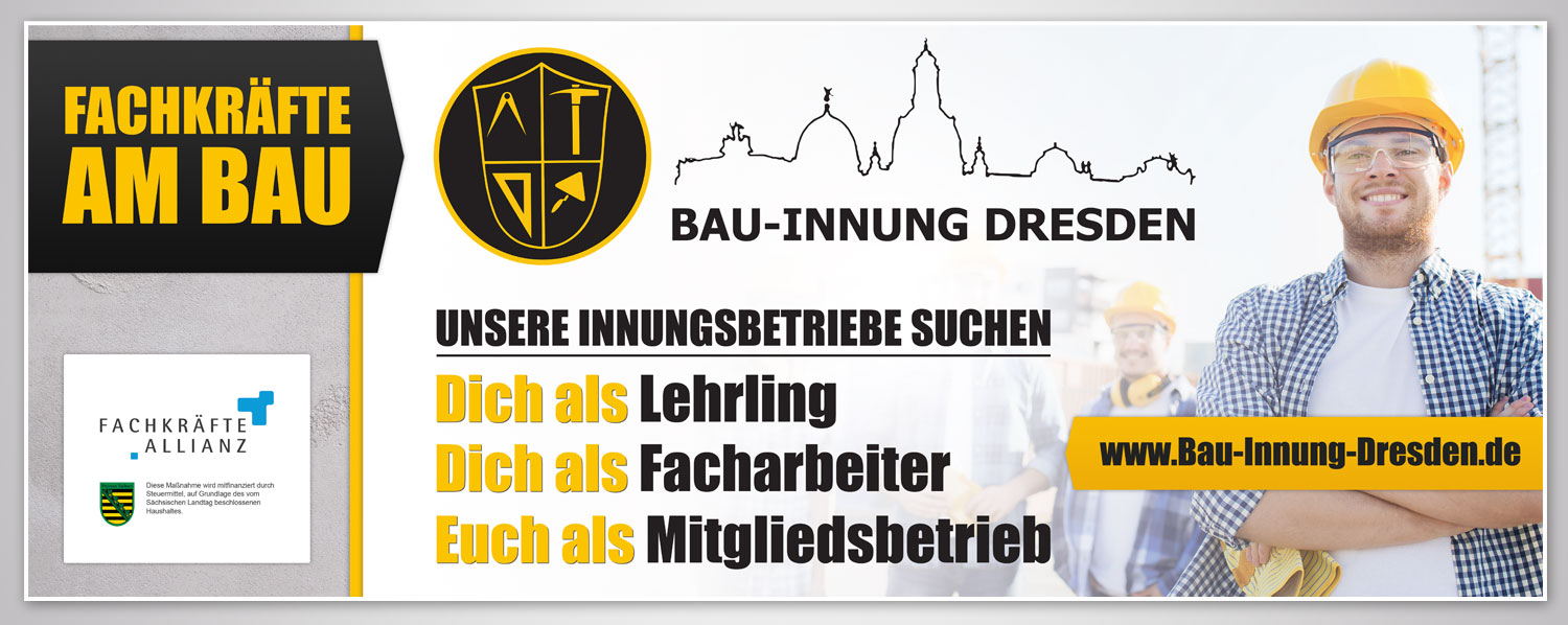 Die Fachkräftekampagne ist eine Initiative unserer Innung zur Sicherung und Gewinnung von Fachkräften im Baugewerbe. Wir wollen damit die Branche stärken, Traditionen wahren und dennoch modern in der Zukunft tätig sein, denn die Anerkennung der Berufsbilder auf dem Bau müssen ins positive Licht gerückt werden. Diese Kampagne wurde von der Fachkräfteallianz Sachsen gefördert und unterstützt. Angefangen beim Layout der Werbemittelträger bis hin zu deren Bestellung und Ausführung standen viele Punkte auf der Agenda über die entschieden werden musste. Zusammen mit Matthias Henker von Desktop Worker erarbeiteten wir die Vorlagen und stimmten alles bis ins Detail ab.