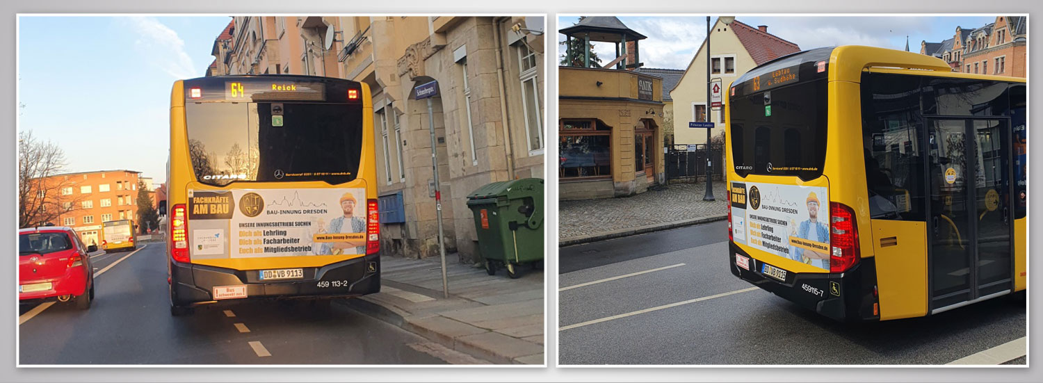 Weiter ging es dann in diesem Jahr mit der Gestaltung und Verwirklichung der Werbung im Stadtverkehr Dresden. Der Vorstand der Innung entschloss sich, fünf Busse über die Firma Ströer Deutsche Städte Medien GmbH für insgesamt zwölf Monate bekleben zu lassen.